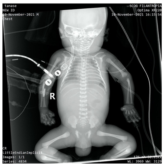 The newborn was admitted to the NICU with an extremely severe condition, pale skin, generalized edema with the appearance of hydrops, generalized purpura, ecchymosis of the cephalic extremity, parietooccipital cephalohematoma, abdomen with important wall edema and ascites fluid. Thoracoabdominal radiography and abdominal ultrasound showed the presence of ascites fluid and poor aeration of the colic frame (Figure 2).