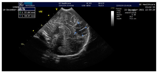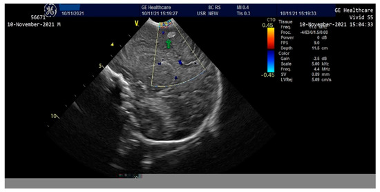 On the third day of life, the patient presented clinically and electrically generalized tonic-clonic seizures (aEEG monitoring)—requiring administration of Phenytoin (i.v) and Midazolam until the 8th day, then continued with Phenobarbital per os. A cranial ultrasound performed on the second day of life showed a round-oval hyperechoic image of 0.6/0.4 cm in the relatively superficial left frontal-parietal cerebral parenchyma which evolved to a left periventricular leukomalacia and left porencephalic cyst at one month of age (Figure 3 and Figure 4). The edema gradually reduced and the ascites disappeared; the intestinal transit became functional after 3–4 days and the enteral feeding was initiated. Parenteral nutrition was discontinued after 14 days. Neurological examination at one month of age accompanied by an EEG recording did not show any significant abnormalities. The patient was discharged after 40 days of hospitalization. At 2 months of evaluation, the patient showed an ascending weight curve and significant improvement in cytolysis and hepatic cholestasis.