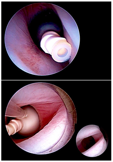 The technique of fetal tracheal balloon occlusion (Figure 2) was developed in order to salvage fetuses with life-threatening pulmonary hypoplasia from left and right diaphragmatic hernias [25,26,27,28,29]. The idea to use this method originated from experimental animal studies that showed that preventing the efflux of lung fluid during fetal life by tracheal ligation results in marked lung distension and growth [28] and from studying “CHAOS” (congenital high airway obstruction syndrome), an experiment of nature in which the same effect can be observed in human fetuses with laryngeal or tracheal atresia.