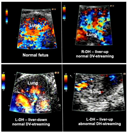 Examples of lung blood flows of a normal fetus (top left) and fetuses with diaphragmatic hernia during diagnostic materno–fetal hyperoxygenation. Most fetuses with liver-down left diaphragmatic hernia (L-DH) exhibit normal streaming of ductus venosus blood into the left side of the heart (bottom left). As a result, both sides of the heart are of equal size, pulmonary blood flow signals are easily visualized, and pulmonary vasodilation in response to diagnostic maternal hyperoxygenation can be produced. In contrast, most fetuses with liver-up L-DH exhibit preferential streaming of ductus venosus blood into the right side of the heart of the fetus. As a result, there is less preload to the left side of the heart, which in turn becomes hypoplastic. In addition, pulmonary blood flow is often markedly decreased (bottom right). Fetuses with right diaphragmatic hernia (R-DH), despite liver herniation, present with normal ductus venosus streaming into the heart. Therefore, as a rule, in these fetuses, neither isolated left, nor isolated right heart hypoplasia are observed, and color Doppler signals of pulmonary blood flow are often normal (top right).