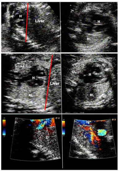 - Stressig, R.; Fimmers, R.; Axt-Fliedner, R.; Gembruch, U.; Kohl, T. Association of Intrathoracic Herniation of the Liver with Left Heart Hypoplasia in Fetuses with a Left Diaphragmatic Hernia but not in Fetuses with a Right Diaphragmatic Hernia. Ultraschall Der Med. Eur. J. Ultrasound 2011, 32 (Suppl. 2), E151–E156. [Google Scholar] [CrossRef]