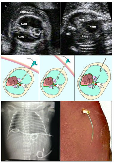 - Baud, D.; Windrim, R.; Kachura, J.R.; Jefferies, A.; Pantazi, S.; Shah, P.; Langer, J.C.; Forsey, J.; Chaturvedi, R.R.; Jaeggi, E.; et al. Minimally invasive fetal therapy for hydropic lung masses: Three different approaches and review of the literature. Ultrasound Obstet. Gynecol. 2013, 42, 440–448. [Google Scholar] [CrossRef]