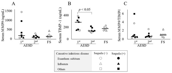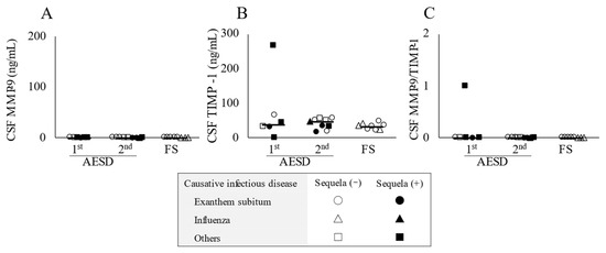 Cerebrospinal fluid (CSF) concentrations of the biomarkers in patients with acute encephalopathy with biphasic seizures and late reduced diffusion (AESD) in the 1st or 2nd seizure phase or with prolonged febrile seizure (FS). CSF levels of matrix metalloproteinase-9 (MMP-9) (A) and tissue inhibitor matrix metalloproteinase-1 (TIMP-1) (B) and the MMP-9/TIMP-1 ratio in CSF (C) in all patients with AESD or prolonged FS. Statistical comparisons by the Tukey–Kramer or Steel–Dwass test. Circles, triangles, and squares represent patients with AESD or FS due to exanthem subitum, influenza, and other infectious diseases, respectively. Filled marks donate patients with sequela (e), and open marks without sequela.