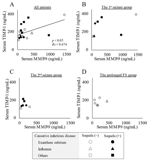 Relationship between serum concentrations of matrix metalloproteinase-9 (MMP-9) and tissue inhibitor matrix metalloproteinase-1 (TIMP-1). (A) Positive correlation between serum concentrations of MMP-9 and TIMP-1 in all patients with acute encephalopathy with biphasic seizures and late reduced diffusion (AESD) or prolonged febrile seizure (FS). Statistical comparisons by Spearman’s correlation test. (B) The 1st seizure phase group. (C) The 2nd seizure phase group. (D) The prolonged FS group. Circles, triangles, and squares represent patients with AESD or FS due to exanthem subitum, influenza, and other infectious diseases, respectively. Filled marks donate patients with sequela (e), and open marks without sequela.