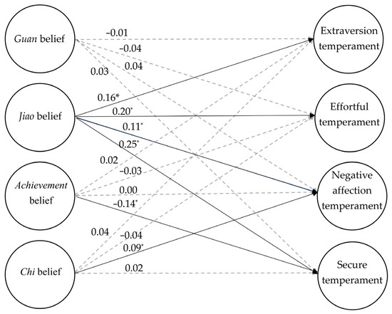 The graphical representation of the effects of Chinese parenting beliefs on temperament and secure attachment. * p < 0.05.