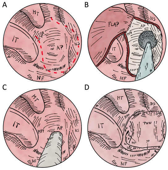 Illustrations of transnasal endoscopic choanoplasty and perforation for the treatment of choanal atresia. (A)–red dashed line shows flap margins before resection of atretic plate in right nasal cavity. (B)–flap is elevated to drill the exposed bone of the atretic plate and posterior nasal septum resection. After the resection, the flap is layed on the exposed bone of medial pterygoid plate and base of the sphenoid. (C)–transnasal perforation technique is shown with or without the assistance of endoscope. There is no mucosal flap elevation. (D) after posterior nasal septum resection and drilling of atretic plate to the level of medial pterygoid plate, an unichoana is created. MT–middle turbinate; IT–inferior turbinate; AP–atretic plate; NS–nasal septum; NF–nasal floor; MPP–medial pterygoid plate; BS–base of the sphenoid sinus; RET–right Eustachian tube; LET–left Eustachian tube; PNW–posterior nasopharyngeal wall; SP–soft palate.