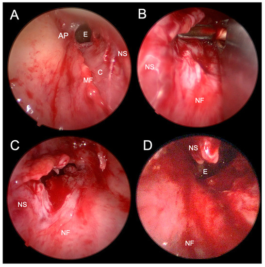 Endoscopic photographs of transnasal endoscopic choanoplasty of bilateral choanal atresia. (A)–after perforation of the atretic plate of the right nasal cavity and elevation of the mucoperichondrial flap of the nasal septum and atretic plate. (B)–resection of the posterior nasal septum with forceps through the left nasal cavity. (C)–after partial resection of the posterior nasal septum visible through the left nasal cavity. (D)–after a partially surgically formed unichoana, which connects both nasal cavities in the posterior nasal septum resection area. AP–atretic plate; E–epipharynx; C–cartilage; MF–mucosal flap; NS–nasal septum; NF–nasal floor.