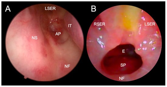 Endoscopic visualization of complete restenosis after transnasal perforation (A) and good patency of unichoana four weeks after transnasal endoscopic choanoplasty (B) of bilateral choanal atresia. A trace of milk and mucus is visible between the two sphenoethmoid recesses in Figure B, suggesting a significant influence of gastric contents reflux on the operative wound healing. LSER - left sphenoethmoid recess; RSER–right sphenoethmoid recess; IT–inferior turbinate; AP–atretic plate; NS–nasal septum; NF–nasal floor; E–epipharynx; SP–soft palate.