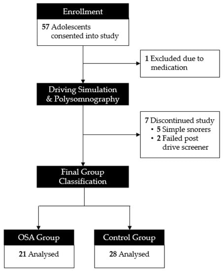 Fifty-seven adolescents consented to participate in the study. One was excluded due to the use of stimulant medication. Seven adolescents were discontinued due to being simple snorers (defined above; n = 5) or due to reporting symptoms of “simulator sickness” following the pre-drive (n = 2). Our final sample included 21 adolescents with OSA and 28 controls without OSA (see Figure 1).