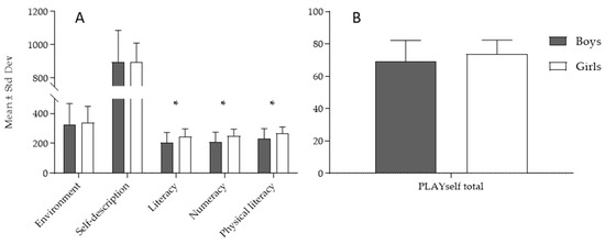 The descriptive statistics and t-test differences between boys and girls in the PLAYself subscores (Figure 1A) and total score (Figure 1B) evidenced higher scores for girls in literacy-subscale (t-test = 3.11, p < 0.05; ES (95%CI): 0.63 (0.18–1.07)—medium ES), numeracy-subscale (t-test = 3.14, p < 0.05; ES (95%CI): 0.67 (0.22–1.18)—medium ES), and physical literacy subscale (t-test = 2.89, p < 0.05; ES (95%CI): 0.59 (0.14–1.03)—medium ES), and no significant difference between boys and girls in the PLAYself total score (t-test = 0.31, p > 0.05).