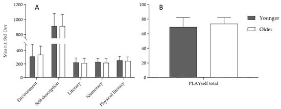 Descriptive statistics in younger and older children in the PLAYself subscores (A) and total score (B).