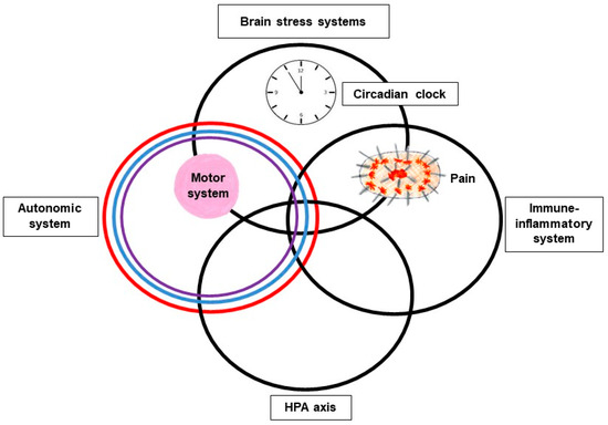 The stress-system model for functional somatic symptoms: Circles metaphor. The overlap between the different components of the stress system—the HPA axis, autonomic nervous system, immune–inflammatory system, and brain stress systems—is presented by the overlap between the circles. The brain stress systems refer to the areas of the brain that are involved with salience detection, arousal, pain, and emotional states. The circadian clock is placed within the top circle because the master clock is found in the hypothalamus, a small region located in the base of the brain. The motor system, which includes central and peripheral components, is represented by the pink ball. The placement of the pink ball in the overlap between the brain stress systems and autonomic system reflects that activation of these systems can be accompanied by changes in motor function. The pain system, which also includes central and peripheral components, is represented by the spiky oval. The placement of pain in the overlap between the brain stress systems and immune–inflammatory system reflects that activation of these systems maintains chronic pain. HPA = hypothalamic–pituitary–adrenal. Reproduced with permission © Kasia Kozlowska 2013 [36].