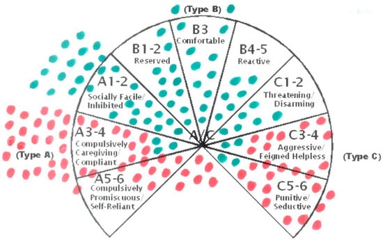 Patterns of attachment in children with functional neurological disorder. The healthy controls (green dots) were classified into the normative patterns of attachment (A1-2, B1-5, C1-2), and the children with functional neurological disorder (the red dots) were classified into the at-risk patterns of attachment strategies, the A+ inhibitory cluster (A3-4, A5-6) and the C+ coercive cluster, C3-4, C5-6). The rates of unresolved loss and trauma assessed via linguistic markers were 75% (n = 57/76) of children with functional neurological disorder versus 12% (n = 9/76) of controls. The dynamic maturational model depicting patterns of attachment is reproduced with permission of Patricia Crittenden, © Patricia M. Crittenden, 2001.