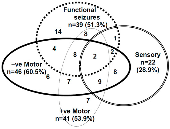 The different types of functional neurological symptoms experienced by the 76 children in the cohort. The majority of children presented with multiple functional neurological symptoms (mixed FND, n = 49; 64%). Negative motor symptoms included the following: weakness or loss of function in the limbs (n = 46; 61%), aphonia (loss of voice; n = 2; 3%), and difficulties swallowing (n = 3; 4%). Positive motor symptoms included the following: unusual/uncoordinated gaits coupled with difficulties with balance (n = 18, 24%), tics (n = 16; 21%), tremors (n = 18; 24%), dystonia (n = 5; 7%), rumination (bringing up food via overactivation of the diaphragm; n = 6; 8%), and dysphonia (change in the quality of the voice, e.g., a high-pitched baby voice, n = 5; 7%). Sensory symptoms included the following: loss of touch (n = 9; 12%), loss of hearing (n = 5; 7%), or loss of vision (n = 11; 14.5%). Functional seizures presented in a broad variety of ways and included faint-like events (n = 39; 51%). Not included in this representation are children who presented with loss of memory (n = 6; 7.9%)—a cognitive symptom—as part of their clinical presentation (see Table 2).