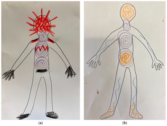 This body map, drawn by an adolescent girl, represents her body in different states of activation. Image (a) reflects her “warning signs” of an impending functional seizure or tic event (she suffered from both). Image (b) represents her state of greater calm following implementation of her regulation strategies. Reproduced with permission. © Kasia Kozlowska 2022.