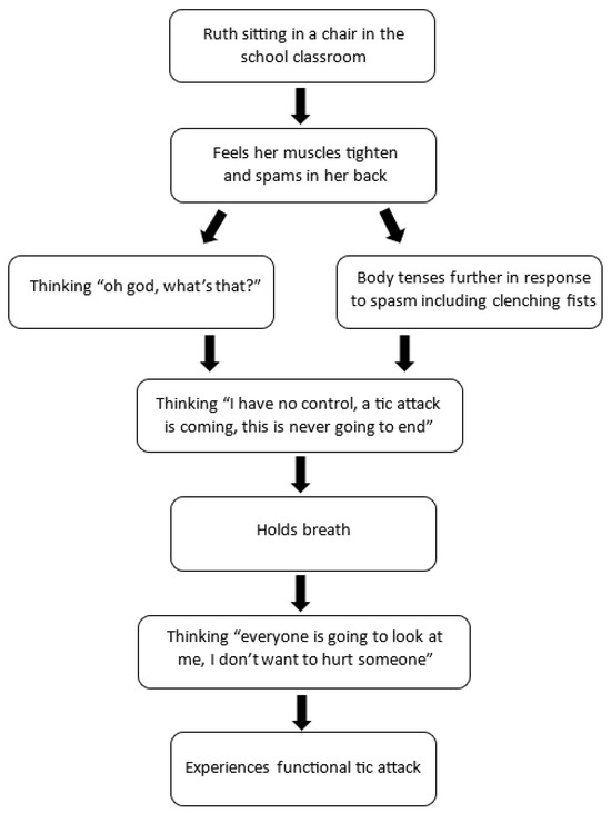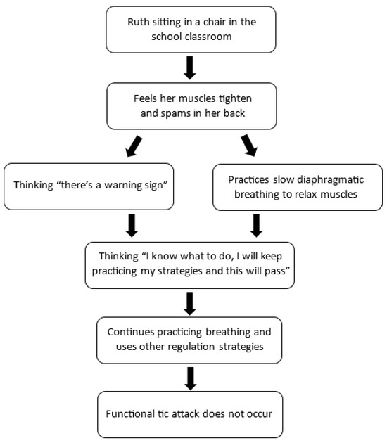 The felt sense of the body refers to the child’s capacity notice how her body is feeling and to notice changes in body state (body sensations). In children with FND, being able to notice states of activation that herald the onset of a functional episode—a functional seizure or a functional tic episode—are an important element of the therapeutic work. Felt sense of the body is a skill that originates from Eastern meditative traditions—including bodywork traditions—a form of bottom-up mindfulness [82,83,84,85]. Our mind–body team refers to this skill as noticing “the body’s level of activation or arousal” or noticing the “warning signs” of a functional seizure or tic episode (see Figure 6). From a neurophysiological perspective these “warning signs” reflect the neurophysiological activation or arousal that is a feature of paediatric FND and that precedes episodic symptoms (see Figure 7) [20].