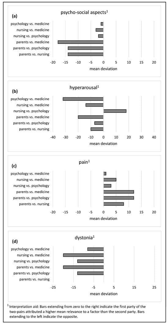 A direct comparison of the six possible two-party constellations was made for the four most relevant PCFs (psycho-social aspects, hyperarousal, pain, and dystonia). Descriptively, parents’ and medical professionals’ ratings of psycho-social aspects were most different. Furthermore, there were large discrepancies between parents and the nurses and psycho-social professionals—on average, nearly 15 percentage points. Overall, all professional raters descriptively attributed greater relevance to psycho-social aspects for IUO than did parents (see Figure 3a).
