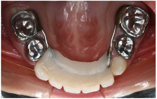 - Chalakkal, P.; Devi, R.S.; Srinivas, G.V.; Venkataramana, P. Dentulous appliance for upper anterior edentulous span. J. Clin. Diagn. Res. 2013, 7, 3086–3087. [Google Scholar] [CrossRef]