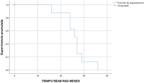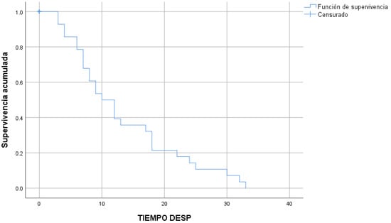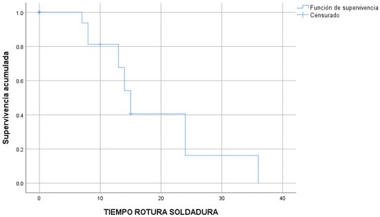 The 14 welding fractures occurred after a median time of 15 ± 0.9 months (Figure 6) and the 28 detachments in turn occurred after a median time of 10 ± 1.8 months (Figure 7).
