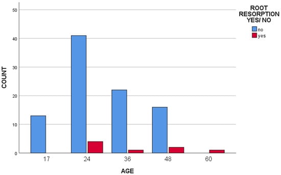 Bar histogram of the correlation between patient age at time of tooth loss and the appearance of root resorptions.