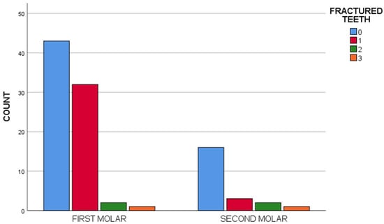 The space maintainer anchoring teeth (first or second molars) showed no statistically significant association (p > 0.05) with any of the studied complications, though maintainers anchored to temporary first molars resulted in a greater number of resin tooth fractures (Figure 10).