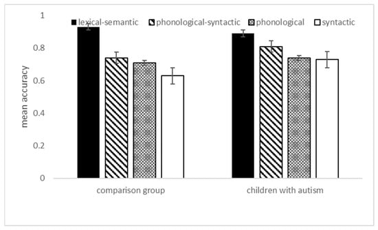 In children with autism, the lexical–semantic markers were associated with greater accuracy than both the phonological–syntactic markers, t(27) = 2.78, p = 0.010, the phonological markers, t(27) = 3.30, p = 0.003, and the syntactic ones, t(27) = 4.38, p < 0.001. The phonological–syntactic markers were associated with greater accuracy than the syntactic ones, t(27) = 2.58, p = 0.016, but no difference in accuracy was found with the phonological markers (p = 0.60). No significant differences were found between the phonological and syntactic markers (p = 0.67).