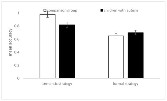 The strategy interacted with the group, F (1, 52) = 17.65, p < 0.001, η²p = 0.25. Paired-sample comparisons were then conducted within each group to obtain a more detailed pattern on strategy use. In the TD group, the semantic strategy led to greater accuracy than the formal one, t (27) = 14.91, p < 0.001; similarly, in children with autism, the semantic strategy produced greater accuracy than the formal one, t (27) = 4.50, p < 0.001.