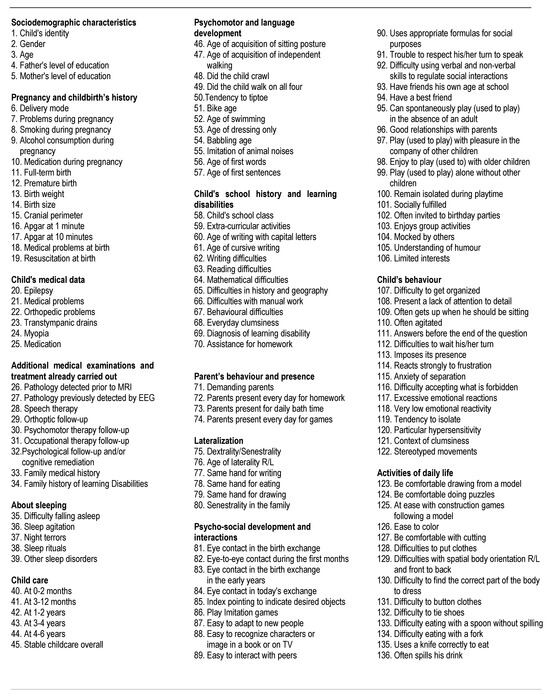 The children’s parents completed a self-report questionnaire as part of a larger wave of data collection on different time-points of the child development, family’s history and socio-behavioral features (136 anamnestic variables, see Figure 1): e.g., pregnancy, term and delivery mode, neonatal period, psychomotor development, health, academic school performances and schoolwork, interpersonal relationships with family and friends at school, child’s behavior and parental socio-economic status. Questions were divided into thirteen sections, and the parents had to complete the questionnaires at different time-points corresponding to childbirth, 0 to 4 months old, 4 months to 1 year old, 1 to 3 years old, 3 to 6 years old, primary school, middle school and high school. Moreover, parents had to specify whether their children present neurodevelopmental disorders based on DSM-5 criteria [1] about learning difficulty, psychomotor and/or psycho-socio-cognitive disorders, as well as therapeutic or remediation follow-up. Answers could be either quantitative (age, grades at school, for example) or dichotomic (“yes” or “no”, for questions such as “Did he/she like to draw?”).