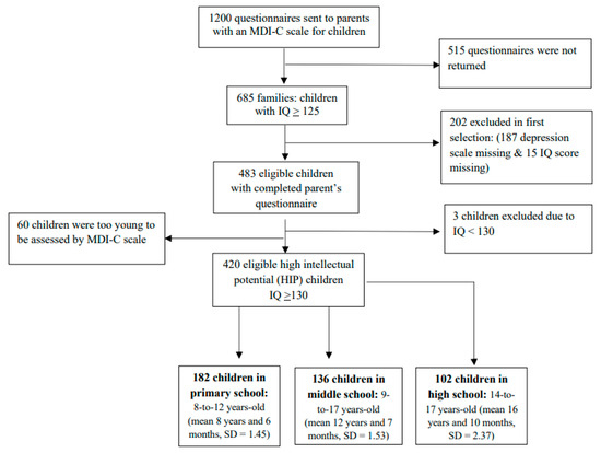 Between October 2015 and April 2017, 685 (57%) of 1200 questionnaires were returned (27% females vs. 73% males), and 420 (35%) eligible gifted children were considered as HIP (≥130) and completed the self-report questionnaire of the depression scale (MDI-C). The flow of participants according to the school level is illustrated in Figure 2.