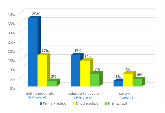 In the 420 HIP children, we identified 205 (49%) with symptoms of depression and 215 (51%) without symptoms of depression including 57% with mild to moderate depression, 38% with moderate to severe depression and 14% with severe depression, with different degrees of severity according to the school level. We distinguished 57% depression at primary school, 38% at middle school, and 14% at high school (Figure 4).