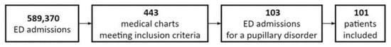 A retrospective single-center cohort study was conducted in the ED of the tertiary-care Children’s Hospital, IRCCS, in collaboration with the postgraduate School of Pediatrics, Faculty of Medicine and Surgery. Patients were identified by keyword searching the hospital’s electronic databases and included all patients younger than 18 years and older than 28 days who accessed the emergency department from 1 January 2010 to 31 December 2019, with acute-onset pupillary motility disorders.