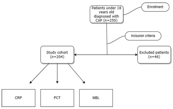 Initially, the records of 250 patients hospitalized with CAP were retrieved, but, as shown in the flowchart (Figure 1), 46 did not meet the study criteria. In accordance with the inclusion criteria, a total of 204 patients aged 4 months to 17 years, with a median age of 42 months, with a positive diagnosis of CAP, were identified and included in the study cohort. The relevant data were retrieved from the hospital’s medical records. The decision for hospitalization was taken in the emergency department based on the personal medical history, clinical examination, and laboratory and imaging findings. After hospitalization, the patients underwent additional tests relevant to the disease, such as CBC (complete blood count) tests, CRP, and PCT. MBL values are available for all of the patients included in this retrospective study as they originate from a significantly larger cohort of children hospitalized in our university clinic, whose levels of MBL were analyzed within other prospective studies in order to assess the relationship between MBL deficit and prognosis of lower respiratory tract disease. All custodians of the participating patients signed a consent form at admission, granting approval of the collection of data that is relevant to the evaluation of the relationship between MBL and lower respiratory tract infections’ prognosis. Therefore, this study was conducted according to the ethical standards of observational studies, and approval was obtained from the Ethics Committee of the hospital.