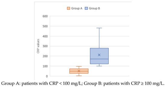 The distribution of the levels of CRP in the study cohort is presented in box-plot form in Figure 2, according to Groups A and B, with low (<100 mg/L) and high levels, respectively. The highest level of CRP in Group A was 98 mg/L, and the lowest was 1.5 mg/L, with a median of 50 mg/L and IQR 27.572 mg/L. In Group B, the minimum CRP level was 100 mg/L, the maximum was 481 mg/L, and the median was 170 mg/L (IQR = 121.7–278.7). The mean CRP level in Group A was 50.85 mg/L; in Group B, it was 212.6 mg/L.