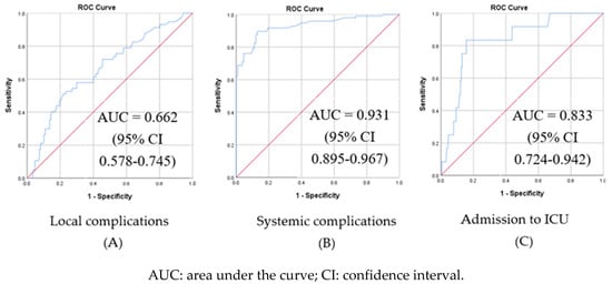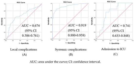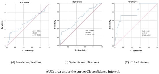 Figure 3 shows the ROC curves for CRP in the study population. CRP performed best as a predictor of systemic complications (SIRS, sepsis, and septic shock), with excellent discrimination (AUC= 0.919, 95% CI = 0.880–0.958), while for the other two conditions (local complications and admission to the ICU), the discrimination level appears to be poor (AUC = 0.674 and 0.741, respectively). This means that the CRP is a relatively weak predictor of local complications and admission to the ICU, although the p-value is <0.0001, which demonstrates statistical significance. The optimal threshold for CRP as a predictor of systemic complications was determined at 115 mg/L (Youden’s J index). According to this threshold, the sensitivity of this test is 83%, and the specificity is 90%.