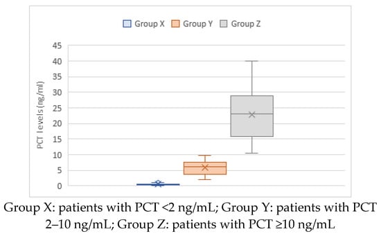 Patients with a PCT level of <2 ng/mL were placed in Group X, those with PCT levels between 2 and 10 ng/mL in Group Y, and those with PCT levels ≥10 ng/mL in Group Z.