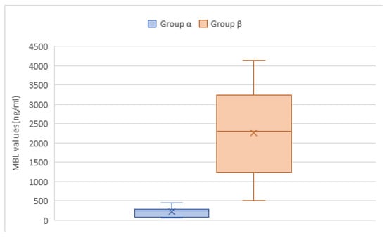 Figure 6 shows the box plot for the distribution of the levels of MBL in the study population, which ranged from 50 ng/mL to 4150 ng/mL, with a mean of 1877.6 ng/mL and a median value of 1580 ng/mL (IQR = 4100 ng/mL). In Group α, the minimum MBL level was 50 ng/mL, the maximum 449 ng/mL, the median 250 ng/mL (IQR = 76–292 ng/mL), and the mean 220 ng/mL. In Group β (the reference group, MBL ≥ 450 ng/mL), the minimum value of MBL is 508 ng/mL, while the maximum one was 4150 ng/mL. The median level of MBL was 2300 ng/mL (IQR = 1245.8–3250 ng/mL), with a mean of 2256.6 ng/mL.