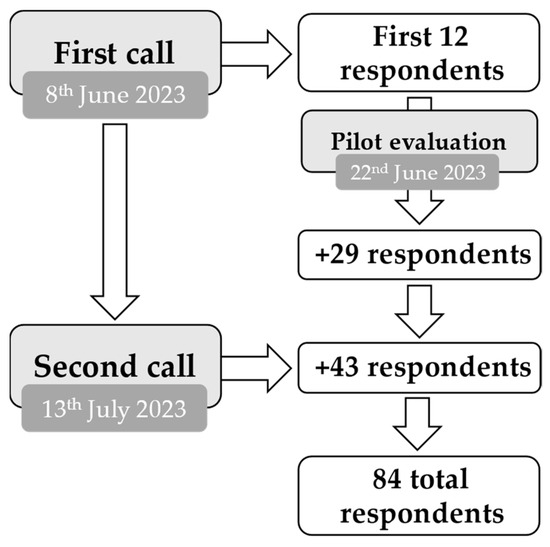 After issuing the first call on the 8th of June, the first 12 responses were evaluated by the expert committee to ensure the clarity and comprehension of the questions and to identify potential problems that could arise during the collection of data. The number of respondents for the pilot test was established according to the guiding literature in this regard [27,28]. Particularly, in his comprehensive work on the construction of questionnaires which established him as an expert in this field, Sheatsley P. stated, based on his extensive research, “it usually takes no more than 12–25 cases to reveal the major difficulties and weaknesses in a pretest questionnaire” [29]. Moreover, in the current study, 12 cases represented more than 10% of the maximum potential respondents (there are 118 schools registered in the County of Sibiu), thus providing an adequate pilot sample size. As no issues were identified, data collection commenced with no further modifications to the methodology or the questionnaires. The sample recruitment process is depicted in Figure 1.