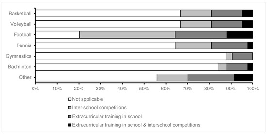 The most frequent extracurricular activities were interschool competitions (detailed in Figure 3), and the most frequently practiced sport was football (described in Figure 4). There were no statistically significant differences in the distributions of the frequencies regarding extracurricular activities or sports played between urban and rural environments.