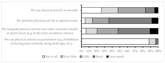 Extracurricular access to outdoor facilities was provided by 72.6% of the respondents, access to sports equipment was provided by 48.8% of respondents, and extracurricular access to school facilities dedicated to physical activity for organized groups was provided by 67.9% of the respondents. There were no significant differences between rural and urban settings regarding these aspects.