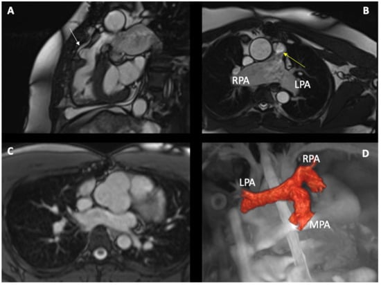 A 40-year-old patient born with TOF and an absent pulmonary valve, post complete TOF repair (7 years of age). Subsequent pulmonary valve replacement with a 23 mm aortic homograft at the age of 32 due to severe pulmonary regurgitation: (A) bSSFP sequence showing unobstructed RVOT with patch used during the repair (white arrow) (B) bSSFP cine sequence acquired in the transaxial plane illustrating dilated PA (right PA (RPA) and left PA (LPA)) and mild acceleration flow in the main pulmonary artery (yellow arrow). (C) bSSFP cine sequence showing a dilated aortic root. (D) A second patient was born with TOF and underwent total repair in the first years of life. The 3D whole heart sequence to show the PAs anatomy.
