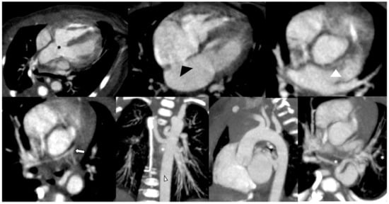 - Han, B.K.; Rigsby, C.K.; Hlavacek, A.; Leipsic, J.; Nicol, E.D.; Siegel, M.J.; Bardo, D.; Abbara, S.; Ghoshhajra, B.; Lesser, J.R.; et al. Computed Tomography Imaging in Patients with Congenital Heart Disease Part I: Rationale and Utility. An Expert Consensus Document of the Society of Cardiovascular Computed Tomography (SCCT): Endorsed by the Society of Pediatric Radiology (SPR) and the North American Society of Cardiac Imaging (NASCI). J. Cardiovasc. Comput. Tomogr. 2015, 9, 475–492. [Google Scholar] [CrossRef]