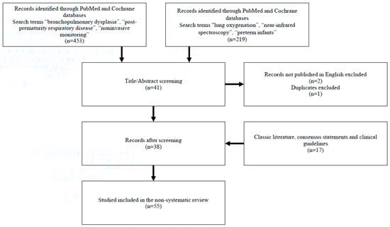 We searched the PubMed and Cochrane databases for articles published in peer-reviewed journals. Search terms included “bronchopulmonary dysplasia”, “post-prematurity respiratory disease”, “noninvasive monitoring”, and, separately, “lung oxygenation”, “near-infrared spectroscopy”, and “preterm infants”. We focused on results published after 2010, but included some results from classic literature, consensus statements, and clinical guidelines. We excluded articles not published in English (Figure 1).