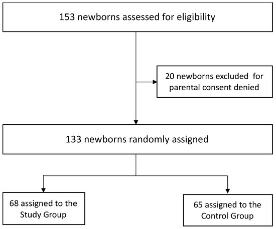 Between October 2019 and March 2021, a total of 153 elegible preterm infants were born; of these, 20 could not be included in the study because their parents refused to give consent. Of the remaining 133 elegible preterm infants, 68 were included in the study group and 65 in the control group (Figure 1).
