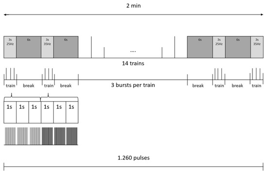 A board-certified physiotherapist supervised all frNMS sessions, which were performed by therapists who were thoroughly trained in the application of frNMS: Every treatment session aimed for 20 min of net stimulation time (10 min per body side). The stimulator (emField Pro, Zimmer MedizinSysteme GmbH, Neu-Ulm, Germany) was equipped with a self-cooling round coil with a diameter of the copper winding of 12.5 cm and a maximum output of 3 Tesla. The stimulator emitted rectangular-shaped, single pulses of 412 µs with the direction of the induced current from the outside to the inside of the coil. This stimulation coil was held in hand by the therapist in a position that assured a distinct contraction of the gluteal muscles (Figure 1). During the active exercises, the therapist continuously followed the movements of the participant to assure an effective stimulation throughout. The ON-time for stimulation was set to 3 s, and the OFF-time was set to 6 s, while the frequency alternated between 25 Hz and 35 Hz, respectively, summing up to a maximum of 12,600 stimuli emitted during 20 min of frNMS training. These parameters were already preset in a customized software program (Figure 2). The intensity of the stimuli was adapted by the therapists at an individual level for the relaxed baseline position of each exercise and body side. The intensity was slowly increased in steps of 6 to 10%, starting at 20% maximum output until a pronounced muscle contraction of the gluteal muscles was clearly visible without voluntary activation by the patient and without causing any pain or discomfort.