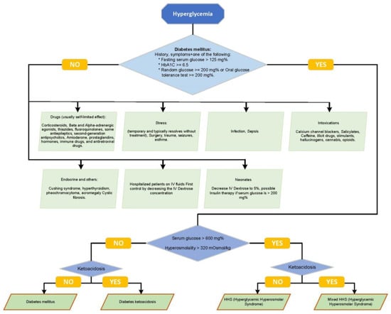 Asymptomatic hyperglycemia is a phenomenon frequently observed in biochemistry profiles, typically presenting as mild and transient, with minimal clinical implications. Nevertheless, a wide range of triggers and etiologies can contribute to elevated blood glucose levels, including serious medical conditions and endocrine disorders, necessitating thorough evaluation and timely intervention [1]. To optimize the screening process and reduce the underdiagnosis of infrequent causes and ambiguous cases, we present a classification of multiple etiologies and various hyperglycemic states in Figure 1 (Algorithm). HHS and DKA are critical hyperglycemic emergencies. They are distinct conditions but are often mistaken for each other [2]. Historically, HHS has been primarily associated with adult patients with type 2 diabetes; however, recent studies have reported an emerging trend in pediatric populations, including those with type 1 diabetes [3].