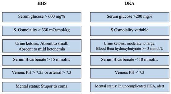Comparative visualization of the distinct characteristics and diagnostic criteria between HHS and DKA [20,21,22].