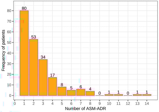 Among the 211 patients who presented ADRs, a total of 548 ASM-ADRs were identified. In total, 80 patients presented at least 1 ADR, 53 had 2 ADRs, and 34 had 3 ADRs, with a total of 167 patients who presented with 1–3 ADRs, with 288 ADRs and an average of 1.7 ADRs per patient. Among the remaining patients (44), 4 to 14 ADRs were observed, with a total of 260 ADRs and an average of 5.9 ADRs per patient. Note that a small number of patients presented a large number of ADRs (from 4 to 14 ADRs; Figure 1).