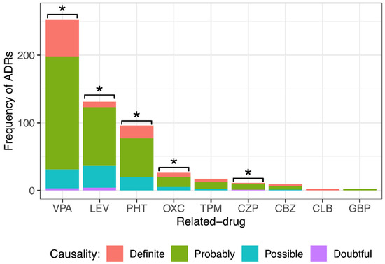 After employing the modified Naranjo algorithm, it was found that of 548 ADRs, 100 (18.3%) were definite, 351 (64.0%) were probable, 89 (16.2%) were possible, and 8 (1.5%) were doubtful. Figure 2 shows the ADR causality classification by drug. VPA caused 55 definite ADRs, 167 probable, 28 possible, and 3 doubtful; LEV caused 8 definite ADRs, 86 probable, 33 possible, and 4 doubtful; PHT caused 19 definite ADRs, 57 probable and 20 possible; OXC caused 7 definite ADRs, 15 probable and 5 possible; TPM caused 5 definite ADRs, 10 probable and 2 possible; CZP caused 1 definite ADR, 9 probable and 1 doubtful; CBZ caused 3 definite ADRs, 5 probable and 1 possible; CLB caused 2 definite ADRs; and GBP caused 2 probable ADRs. For statistical analysis, since there were very few doubtful ADRs, they were grouped into the “possible” group. Note that most ADRs were classified as probable. The results showed a significant difference among the different causality degrees with VPA, LEV, PHT, OXC, and CZP. No significant difference was observed in the degree of causality with TPM, CBZ, CLB, or GBP.