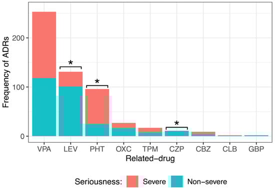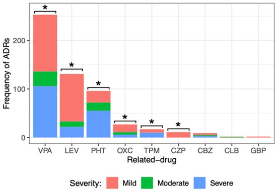 When dividing the severity of ADRs generated by each drug, it was observed that most of them caused mild ADRs: VPA (117, 46%), LEV (98, 75%), PHT (24, 25%), OXC (16, 59%), and TPM (7, 41%). All ADRs of CZP (11) and GBP (2) were mild. Severe ADRs were frequent for drugs such as VPA (106, 42%), LEV (22, 17%), PHT (55, 57%), OXC (6, 22%), and TPM (10, 59%). Statistical analysis showed a significant difference among the severity degrees of ADRs (mild, moderate, and severe) caused by VPA, LEV, PHT, OXC, TPM, and CZP. No significant difference was observed in the degree of severity of the ADRs caused by CBZ, CLB, or GBP. It is important to point out that LEV, OXC, and CZP caused milder ADRs, and PHT and TPM caused more severe ADRs.