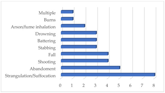 The most common method of homicide in our study was strangulation (usually combined with suffocation) (23.5%), followed by abandonment (14.7%). Shooting with a firearm, throwing from a height, stabbing, battering, arson (death due to the inhalation of fumes) and burning are methods also mentioned in previous studies on filicides. In a very large study including 94,146 filicide arrests in the USA over a 32-year period, it was found that the most common killing methods included beating with hands and feet, strangulation, asphyxiation, drowning, and throwing from a height—defenestration [40]. In a binational study in Austria and Finland of 120 filicide perpetrators who committed their crimes during the period 1995–2005, arson, beating, negligence, drowning, poisoning, shooting, stabbing, strangulation, and suffocation were mentioned as the methods used [47].